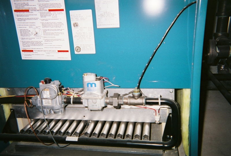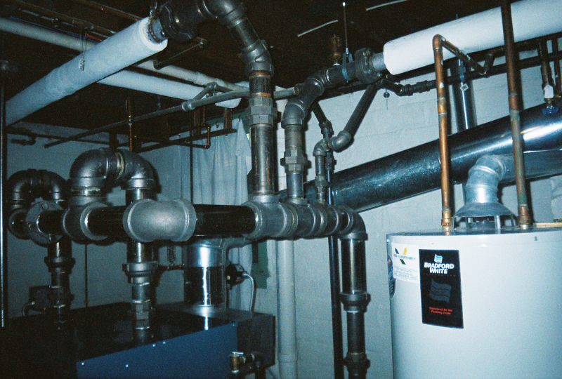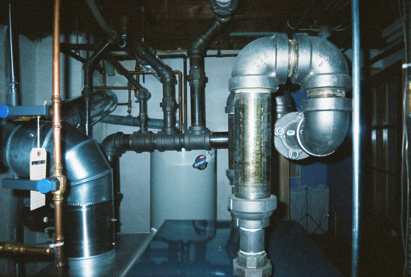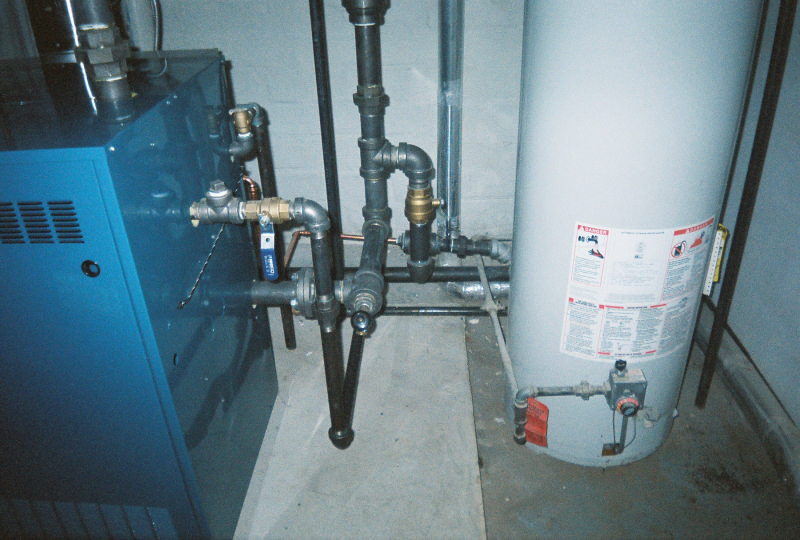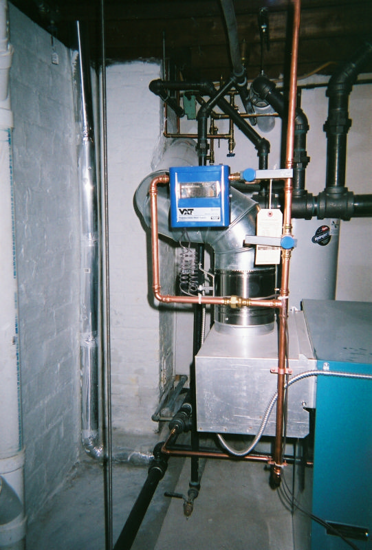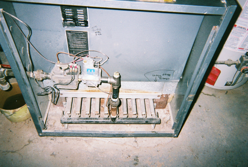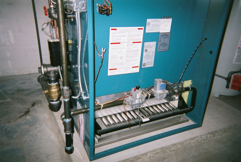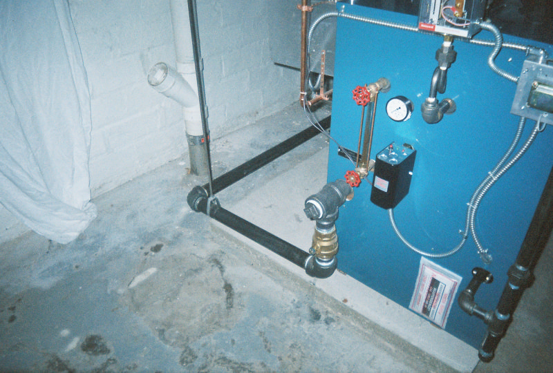 We replaced the boiler that was here because it leaked at the upper nipple joint. In one picture you can see someone found the leak in 1999 and even noted it on the boiler with a marker. They told each subsequent serviceman the boiler leaked. It would have been nice if they had actually told the homeowner. But they didn't, and when I did we got the job of replacing the boiler. The system is a Trane Company system so we installed a low fire gas valve to keep the boiler in vapor. The Trane systems were vapor systems. We lowered the water seal at the end of the main so that we didn't need a false waterline or have to put the boiler up on a pedestal.