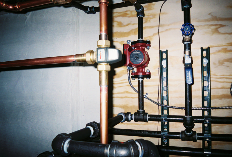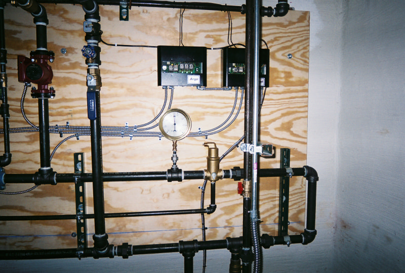 This is a water boiler replacement for a house that was still operating on gravity hot water heat. Some years ago, some yoyo took the asbestos off the Mercer boiler, but that left gaps in the heat exchanger big enough to put your fingers in. You could actually see into the flame. The electrician who is the clients regular guy, said he couldn't stand to be in the basement during winter. No dought! He was getting fumigated. Someone actually covered the boiler with wall cavity insulation in a sorry attempt at replicating the asbestos cement. We put in a Munchkin and an Ergomax combination buffer tank and water heater. The original single zone is now three zones. Two high temperature and one radiant floor.