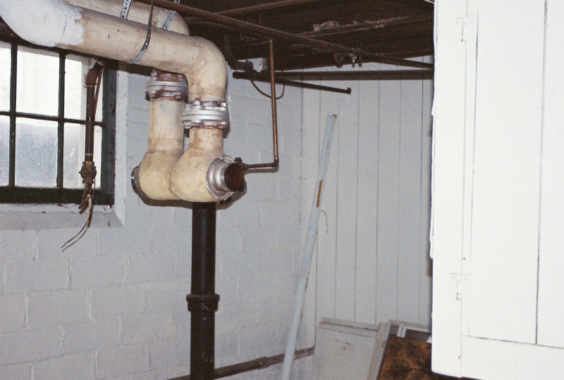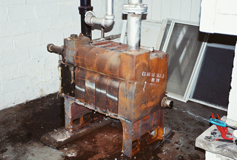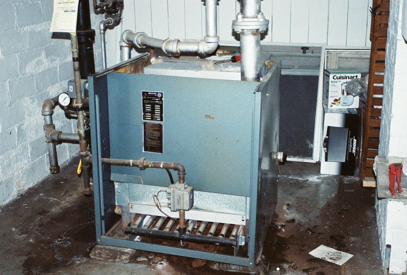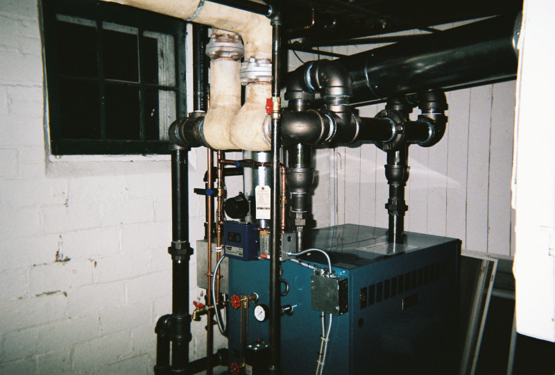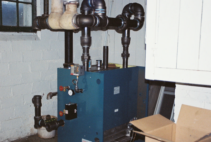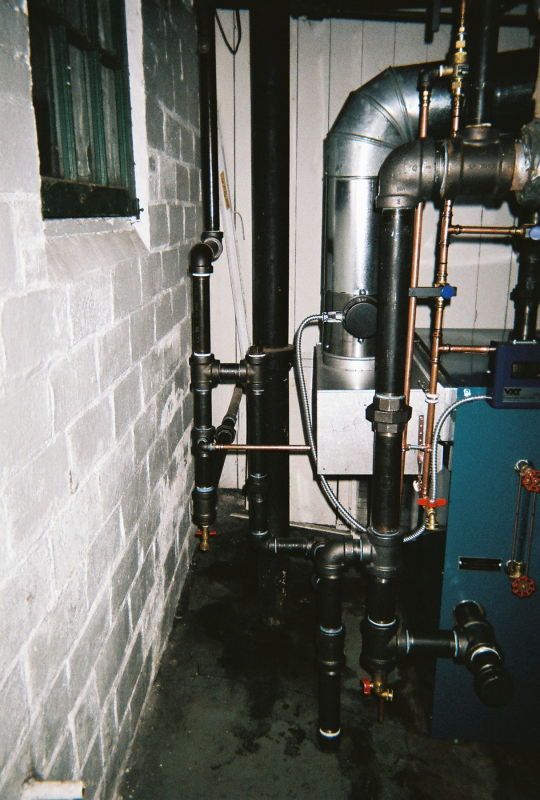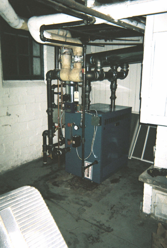 This was a weekend emergency steam boiler replacement. The old boiler started leaking at mid week, and a replacement was ordered for a friday delivery. On thursday evening the bottom of the old boiler let loose enough to cause flame rollout and a susequent fire department arrival. So we went into overtime mode and brought in the whole group and gang tackled this job so that we could get the heat back on as fast as possible. With the help of Steve's sons we started saturday morning and had it completed sunday evening. This was a bit different in that we were able to incorporate part of the original header into the the new header and not have to call in for asbestos abatement. We added a false waterline to this system since the wet returns are very high on the wall. The boiler is a Burnham Independence model.