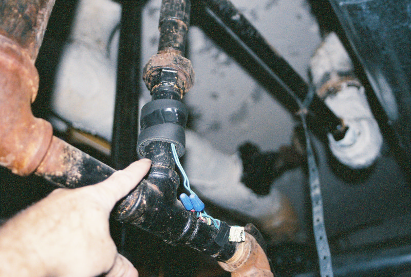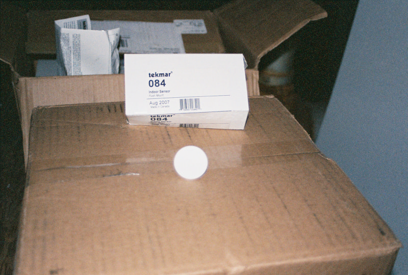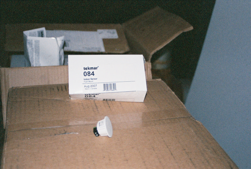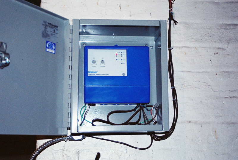 The old Tekmar steam control had its cover broken by an unhappy tenant who really wanted to get at the control dials. The control never functioned well because the installer put the sensor that starts the timing sequence on the return pipe back at the boiler area. They set it to 130 degrees. The boiler would just run and run for hours because the sensor would never heat up at that location. We moved the sensor to a more appropriate place and it now performs its job well. We didn't want to allow anyone access to the control, so we installed it in a steel lock box. Indoor sensors were added at four locations throughout the building to provide feedback to the control. Without them the control really has no way of knowing what the inside temperature is.