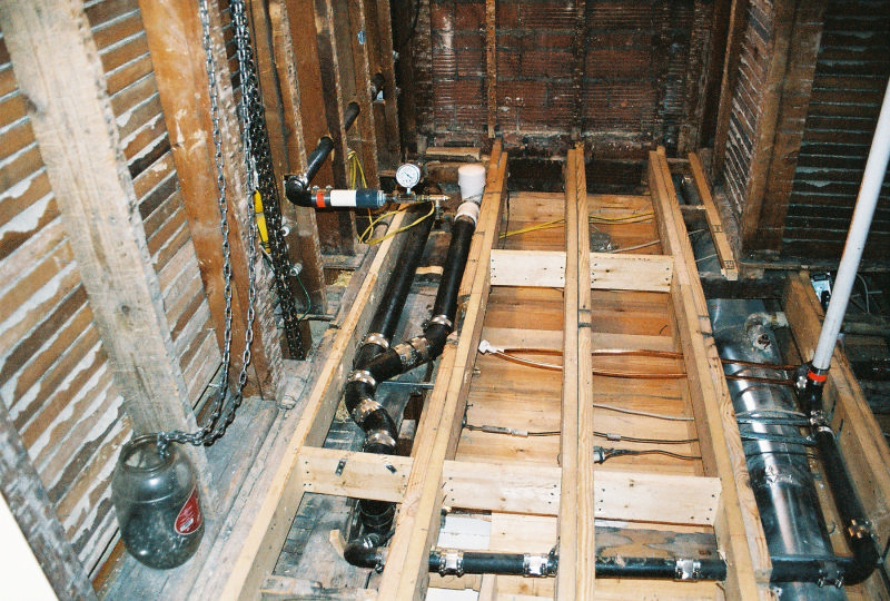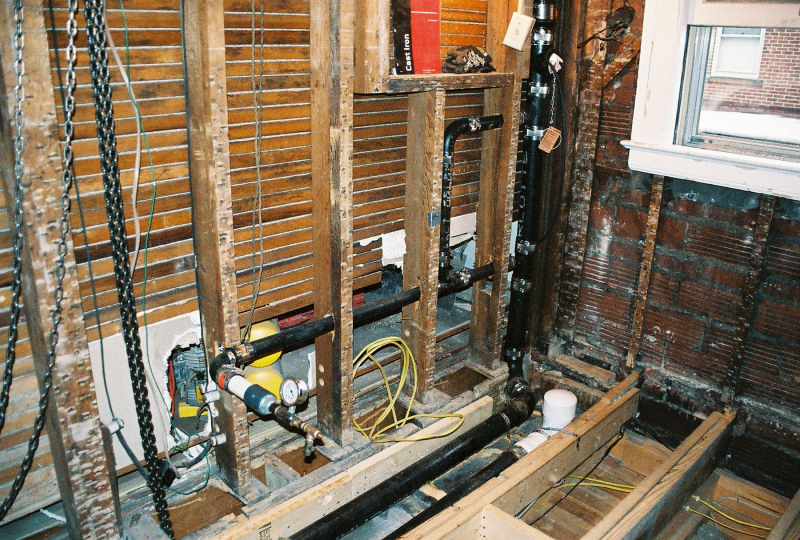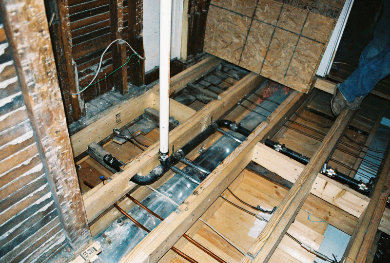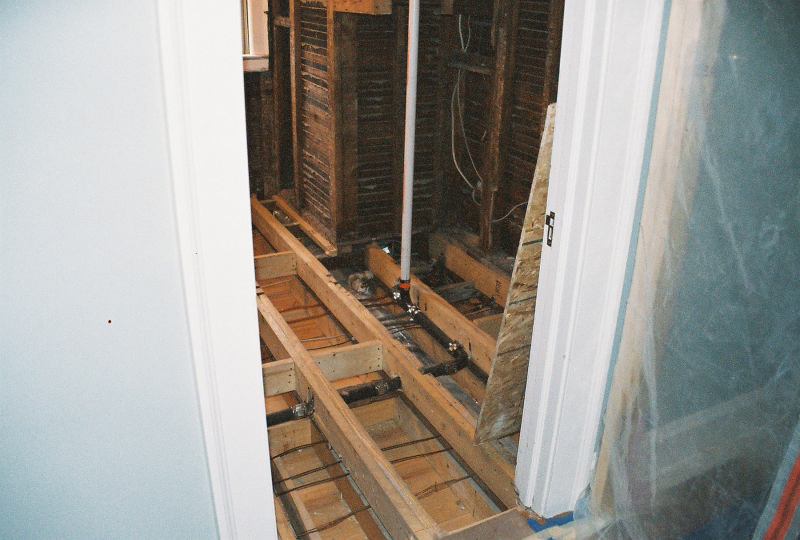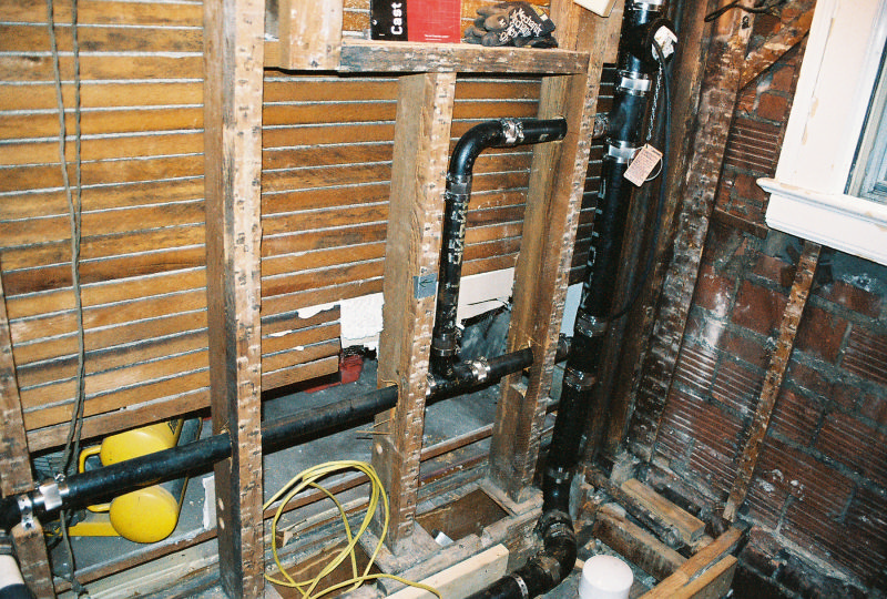This guest bathroom is being redone at the same time as the master bathroom. We ran a new soil stack from the basement up to the second floor for this room also. We were able to do this without disturbing the walls on the first floor. Cast iron piping was used to quiet down the drains since they traverse the dining room.