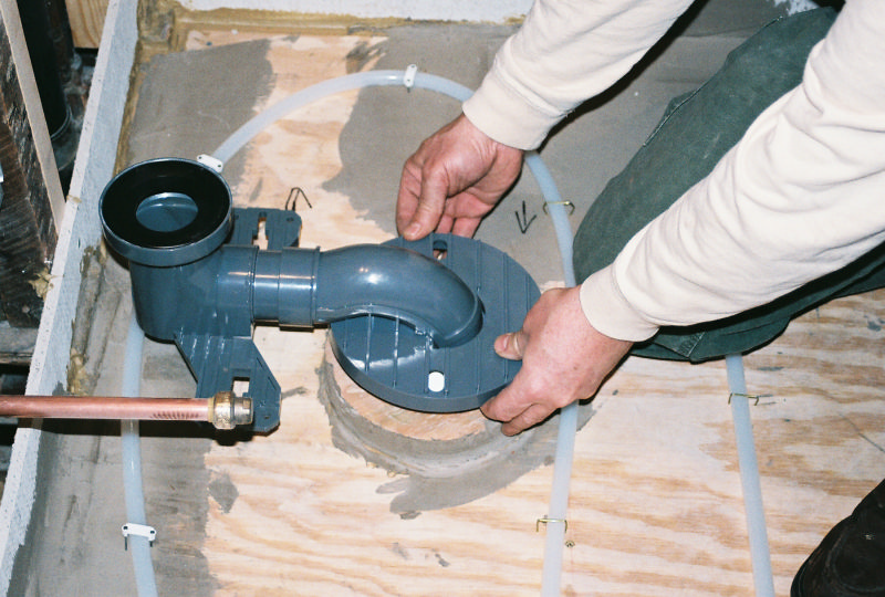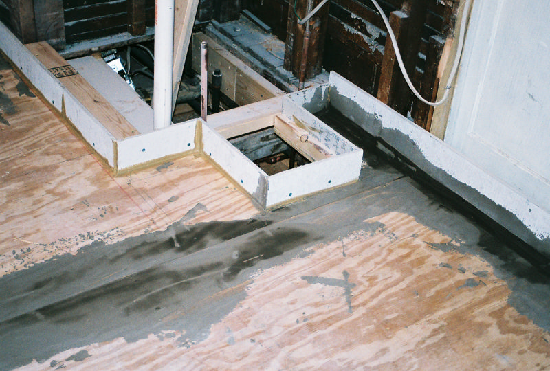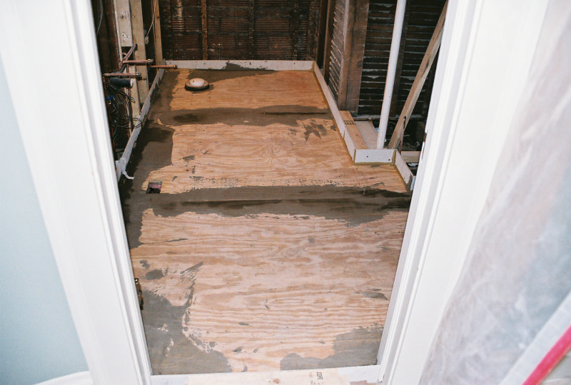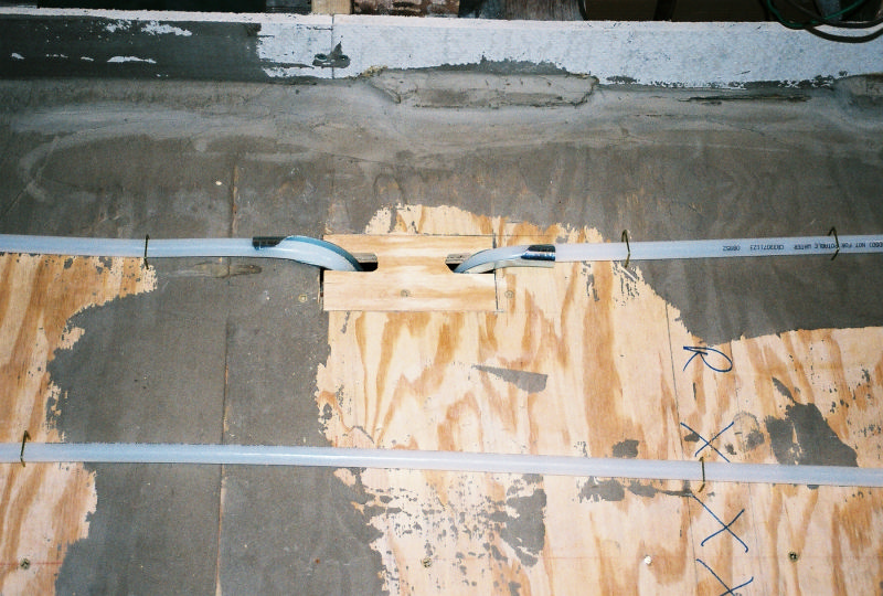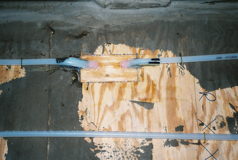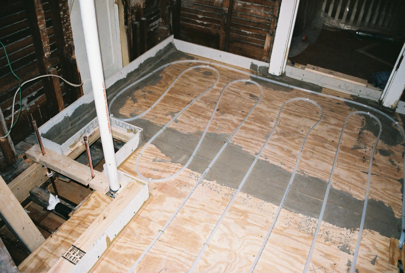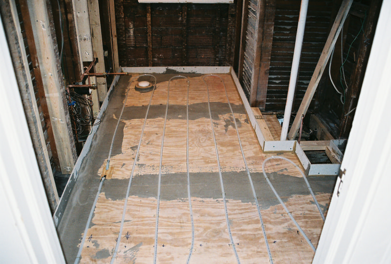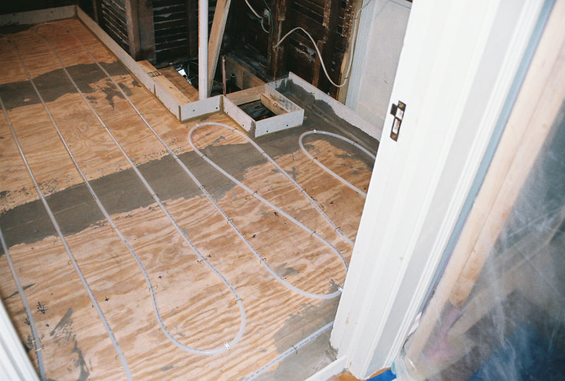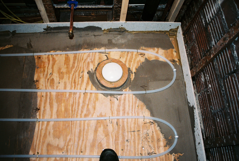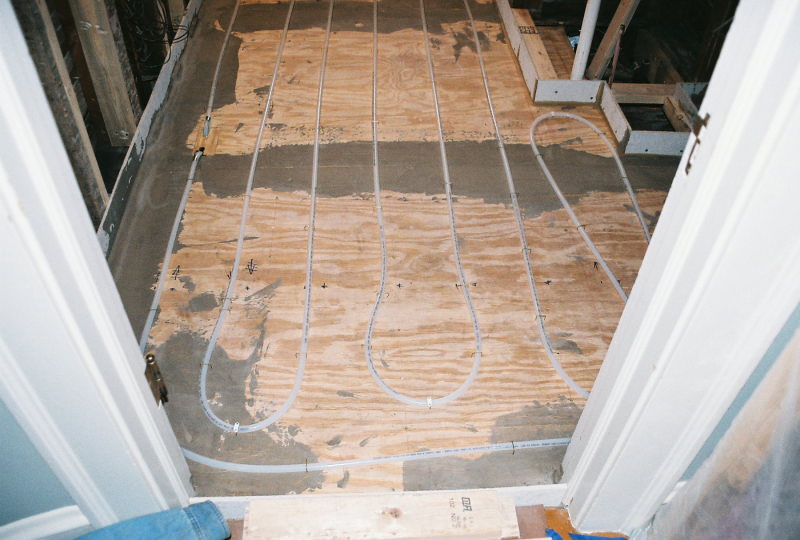 This guest bathroom is being redone at the same time as the master bathroom. The room had a radiator that was removed, and now the room will be heated by radiant floor heat. The tubing is a single loop of 1/2'' tube and is also installed under the area the tub will sit in order to keep the cast iron warm. The flooring contractor poured Ardex down to imbed the tubes and provide a level surface.