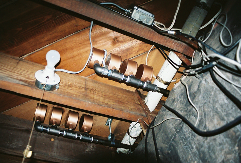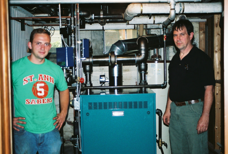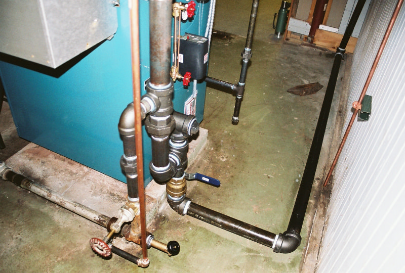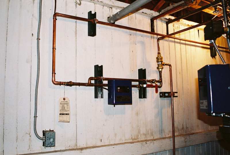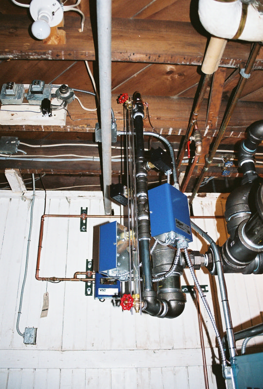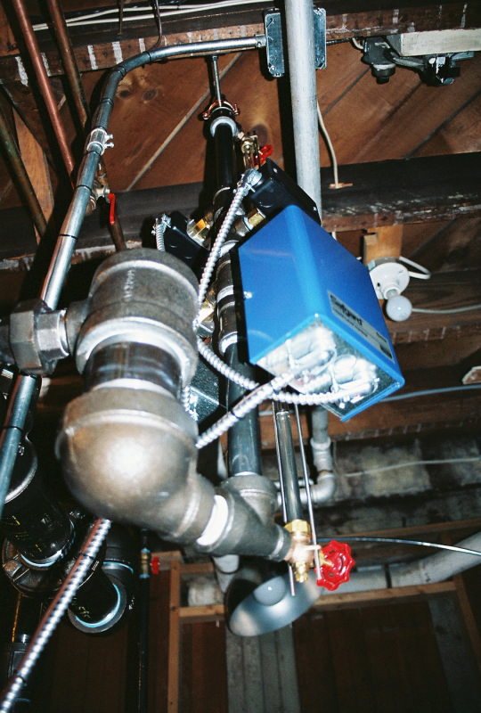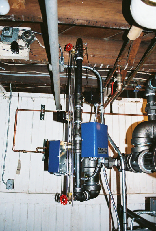 We removed an aging steam boiler and installed this Burnham steamer. The system is a vapor system and to control the pressure we installed Steve Pajek's latest invention. It a water gauge glass with electronic probes mounted in a column. When the pressure forces water up the column from the column reservoir, it hits the probes which act as switches for the low fire feature, and the operating limit. We've named this device the Pajek Electronic Pressure Controller.