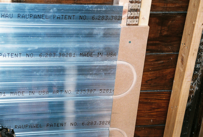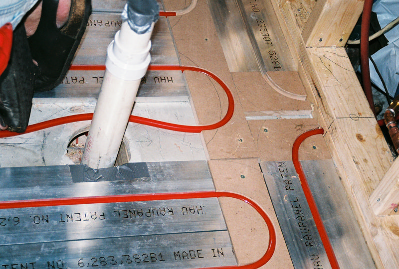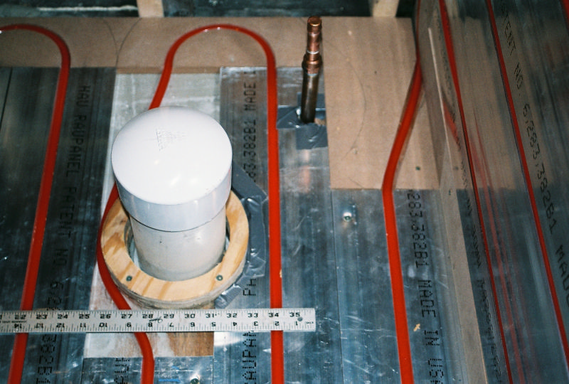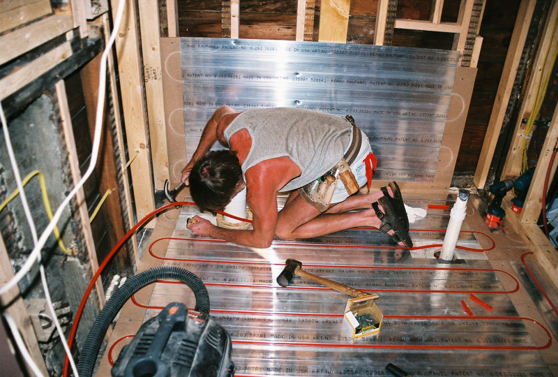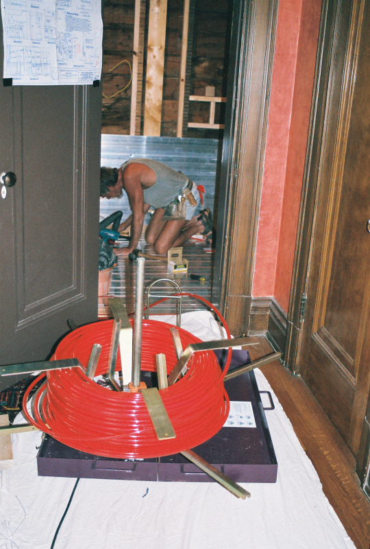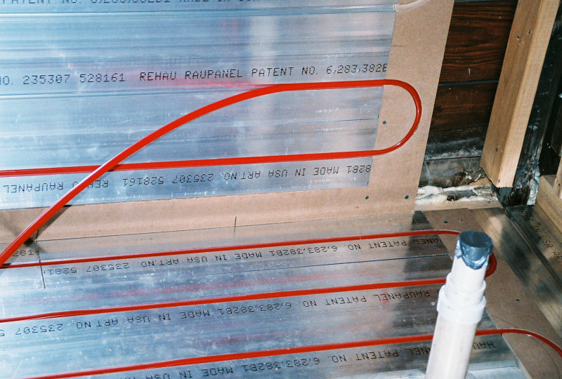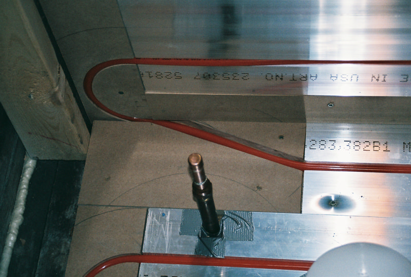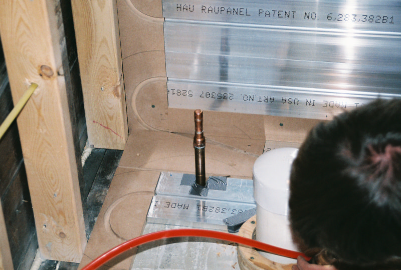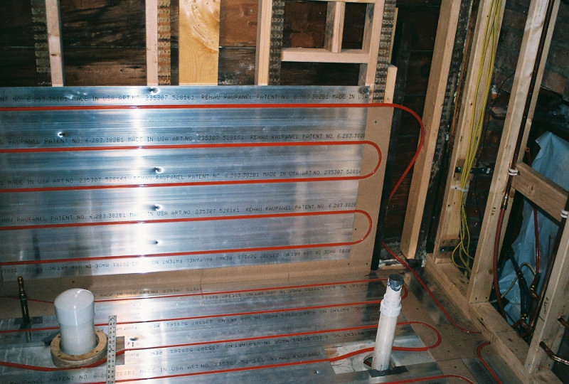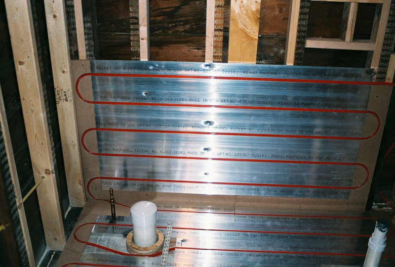This is Peter Hochberg's residential office bathrooms radiant floor and radiant wall panel system. This is part of a remodel we are doing with Emery Remodeling. The panels were put down by Joe's carpenter and he and myself installed the pex tubing into its grooves. The carpenters routered out the return bend tracks and did one heck of a great job.