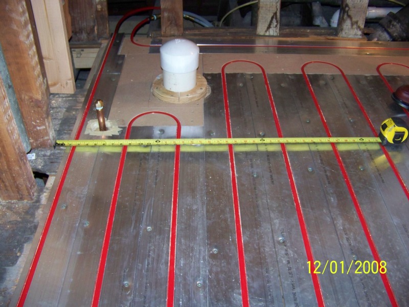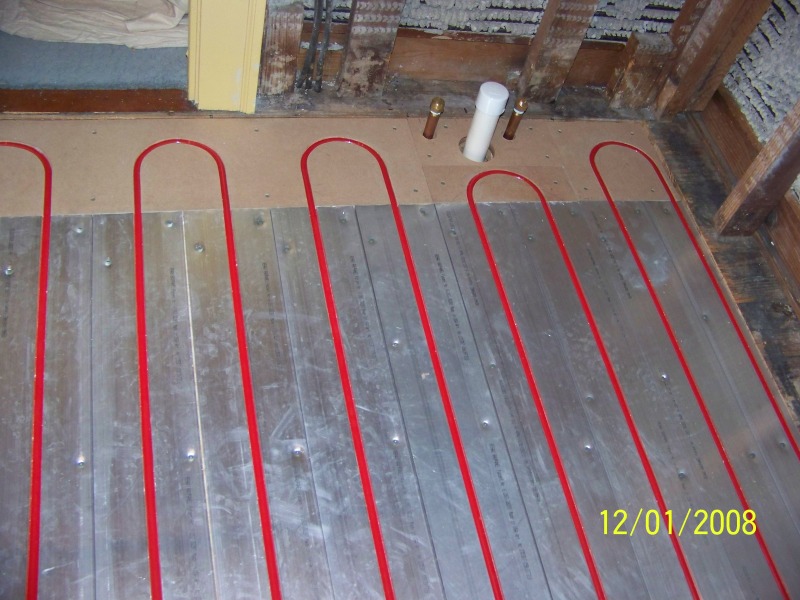 This is another Joe Emery Remodeling job in which a third floor bathroom was gutted and is being remodeled. The house is steam heated but the relatively large bathroom radiator was positioned in the main access to the bathroom. We took it out and capped the pipes. Then the radiant floor was put in. We ran pex tubing thru the walls to the basement to feed this radiant from the water of the steam boiler.