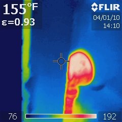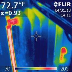 This pictured radiator is an example of what happens to a radiator when another radiator nearby has a failed steam trap, that has failed open and allows steam to blow into the return pipe. In the case of this particular radiator the next room over had a bad radiator trap. Now the interesting part is this radiator pictured is a good radiator. Its not heating. It however has nothing wrong with it. The bad radiator is the screaming hot radiator in the next room over. This can at times be difficult to communicate to someone. In their eyes the bad radiator is the cold radiator. See whats happening in the picture. The steam is trying to get into the radiator, but the air can't get out because the radiator trap is closed from reverse by steam that has blown through the next rooms radiators bad trap. The radiator is actually air locked and will remain cold. I call it steam locked since steam is on both sides of it. Interesting huh! The thermal picture is worth a thousand words in trying to explain this one.