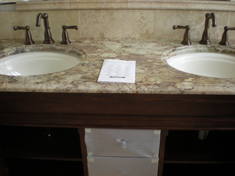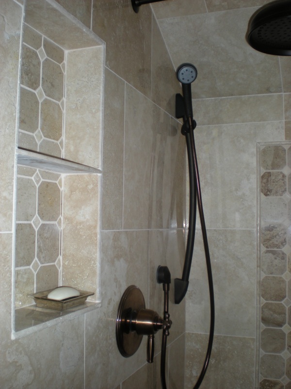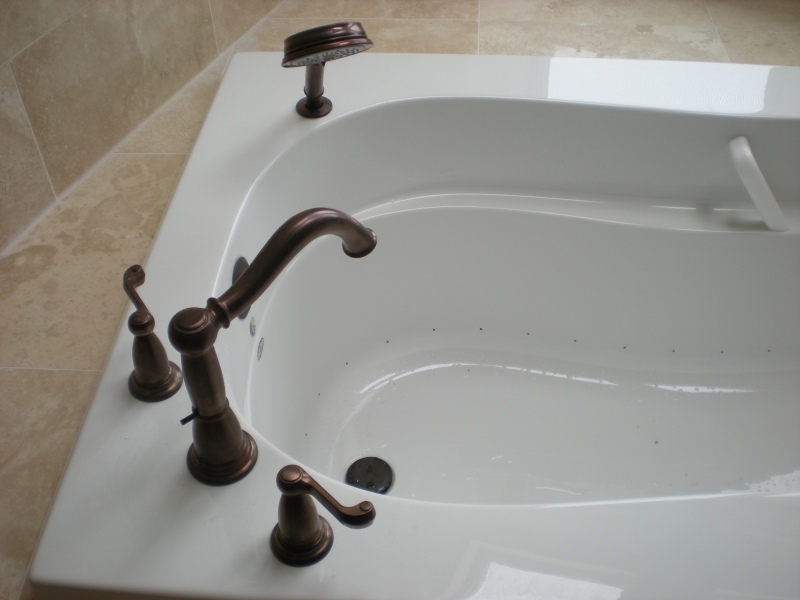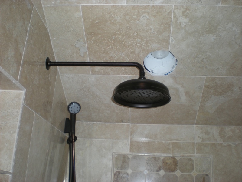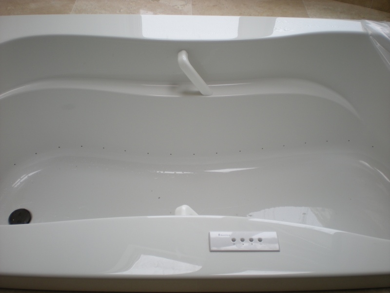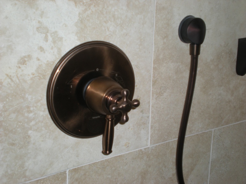 This bathroom we replaced the shower valve and installed a rain head and hand held spray. We also reroughed the lav sink drain in order to remove the sanitary cross fitting so that drain cleaning would be easier in the future. We installed the new faucetry which was all HansGrohe fixtures. The tub is an air jet Baine Ultra Bath.