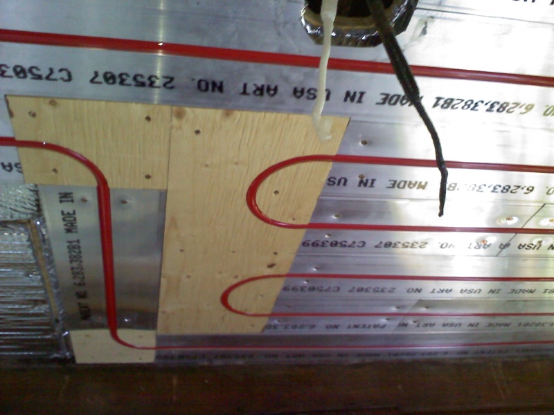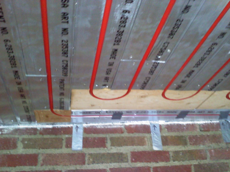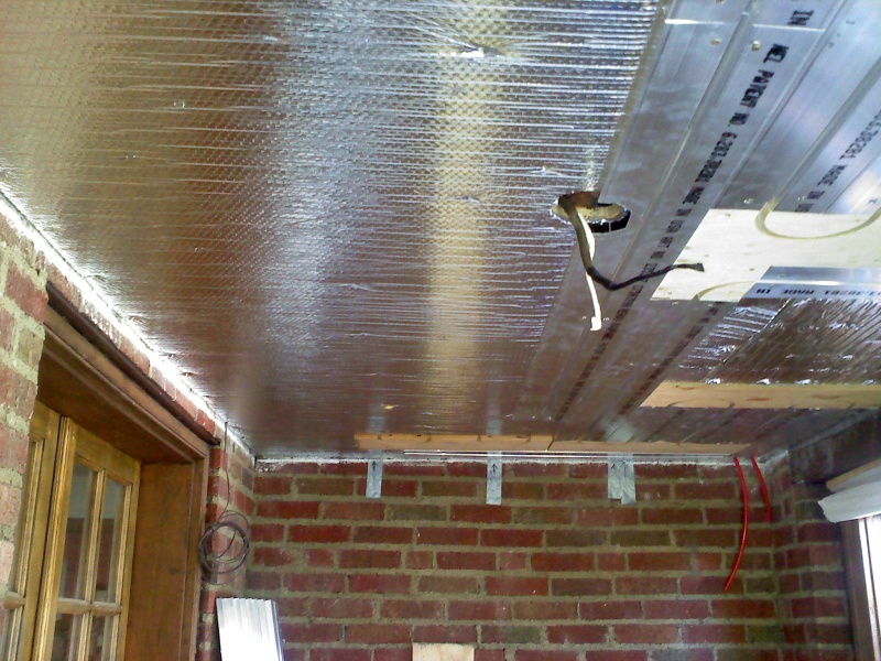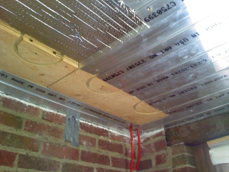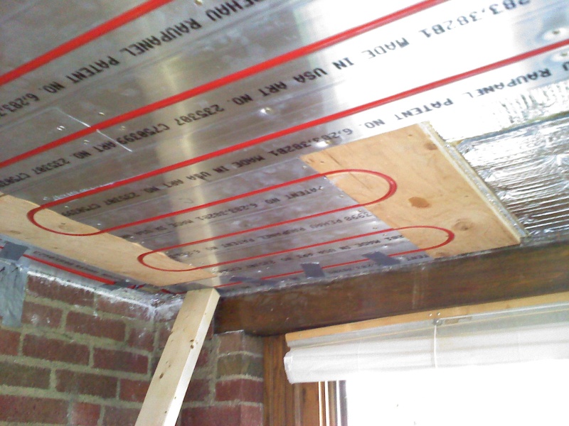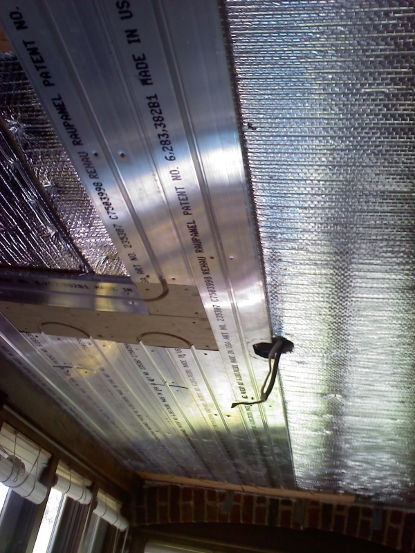 This is an enclosed back porch that is being turned into an office. The floor doesn't provide enough square footage to heat the room, so we also installed a radiant ceiling in this room. We used Rehau panels for this. We left an area of the ceiling under the upstairs shower stall undone, just in case someday we have to access the the shower drain from below thru the ceiling.