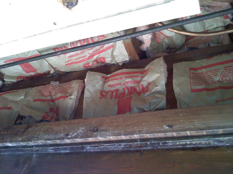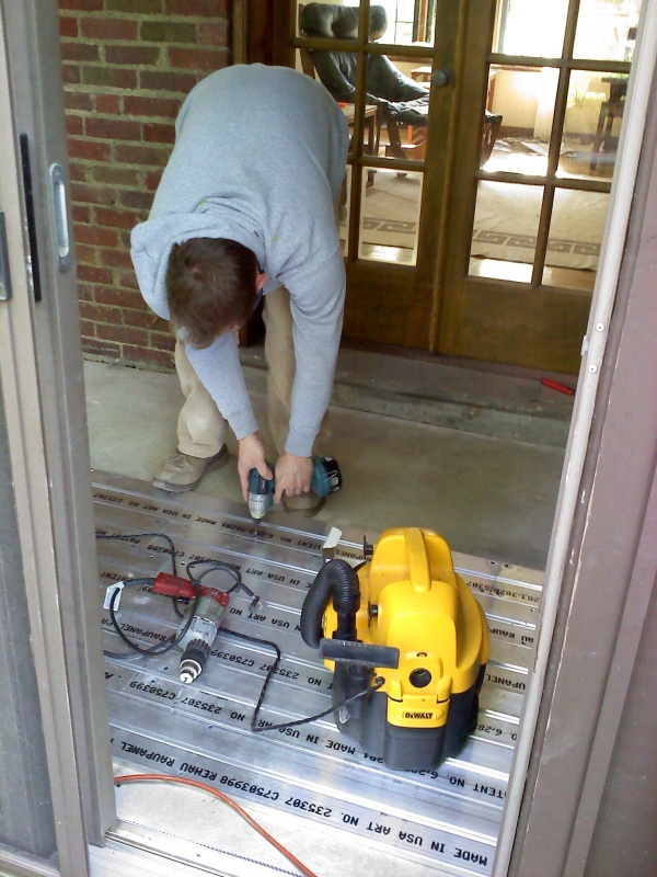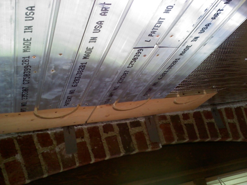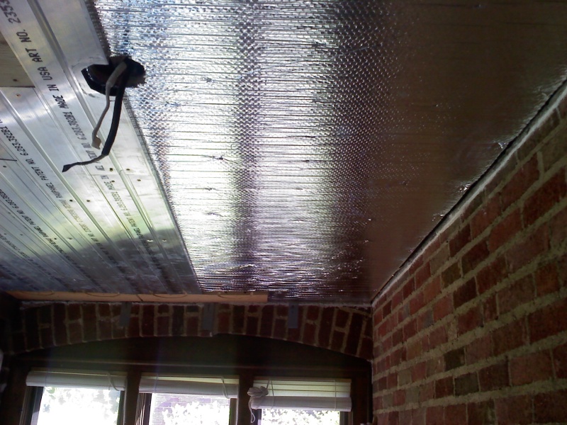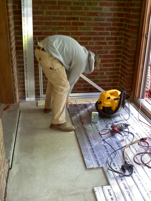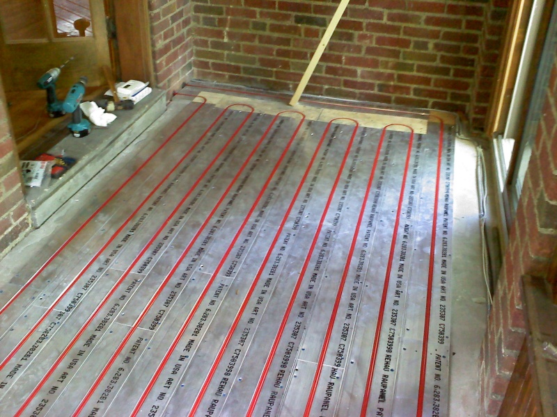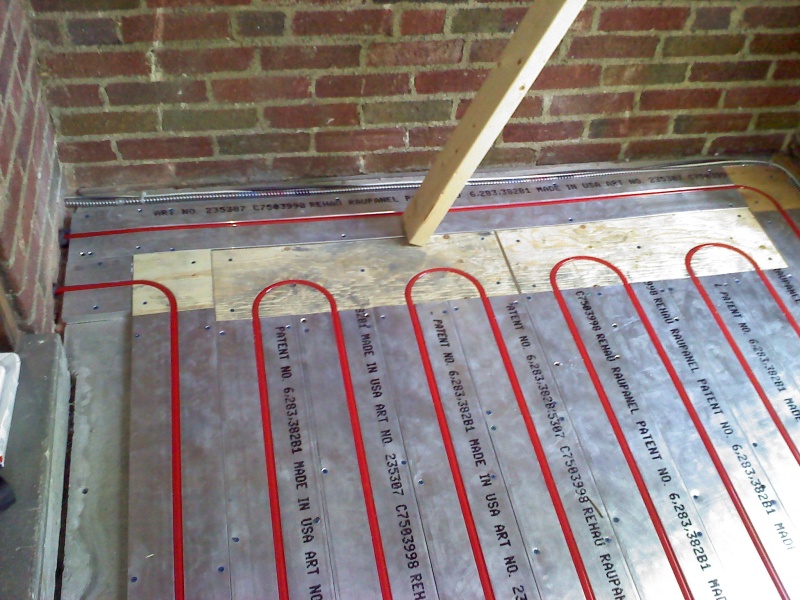 This is an enclosed back porch that is being turned into an office. The floor doesn't provide enough square footage to heat the room, so we also installed a radiant ceiling in this room. We used Rehau panels for this. We left an area of the ceiling under the upstairs shower stall undone, just in case someday we have to access the the shower drain from below thru the ceiling.