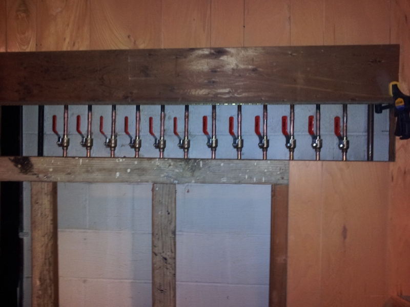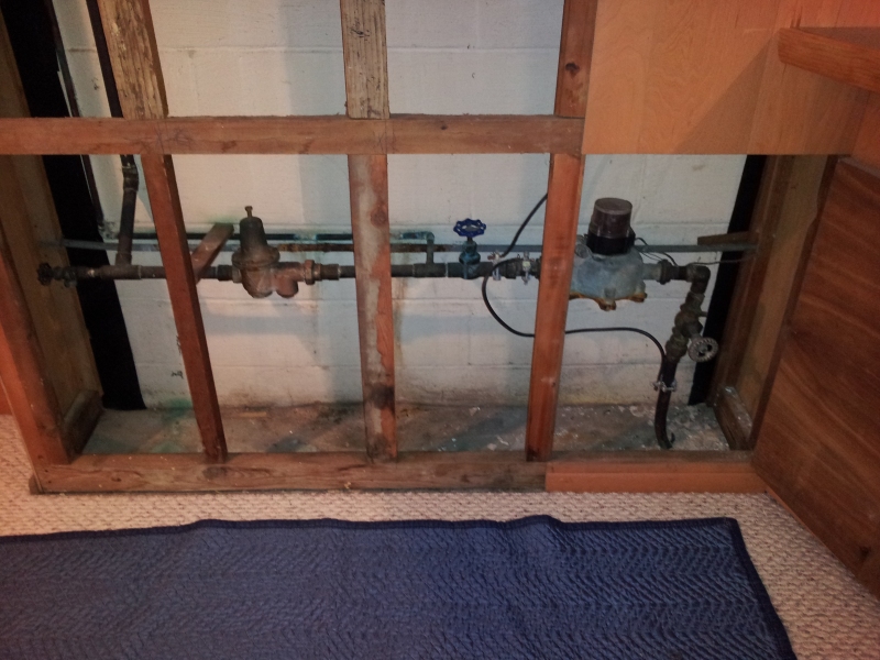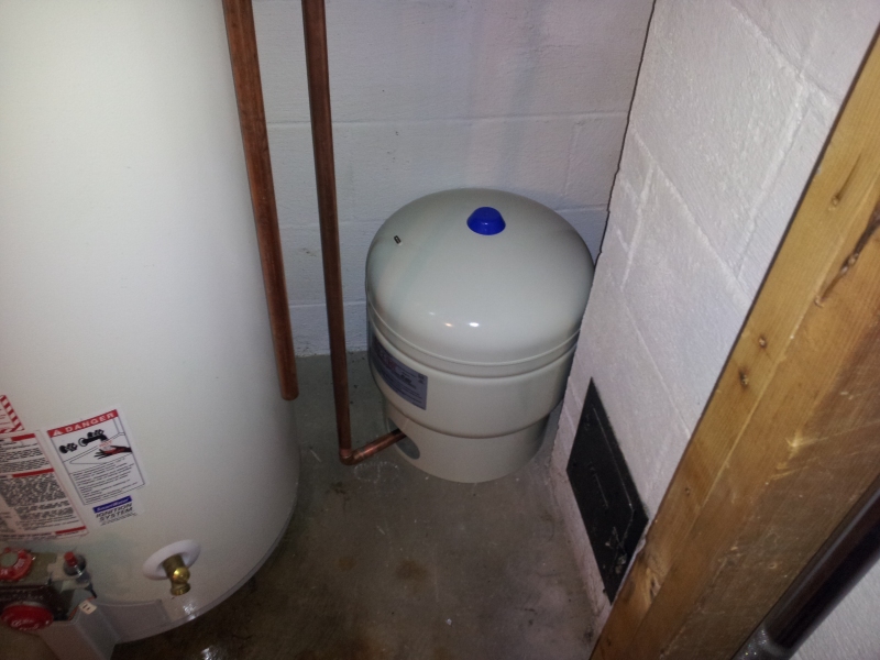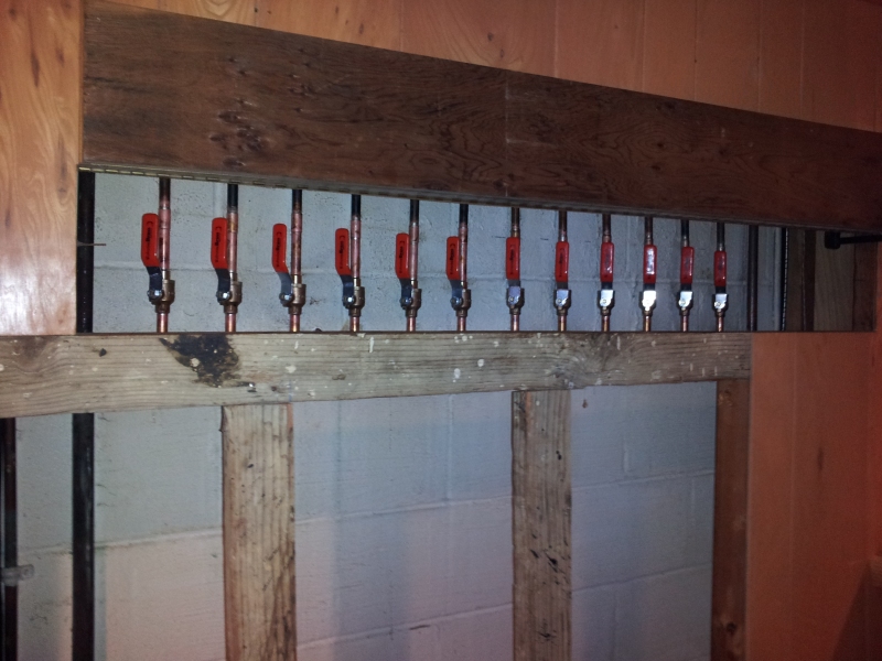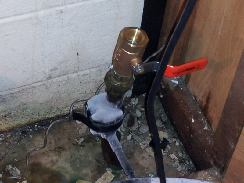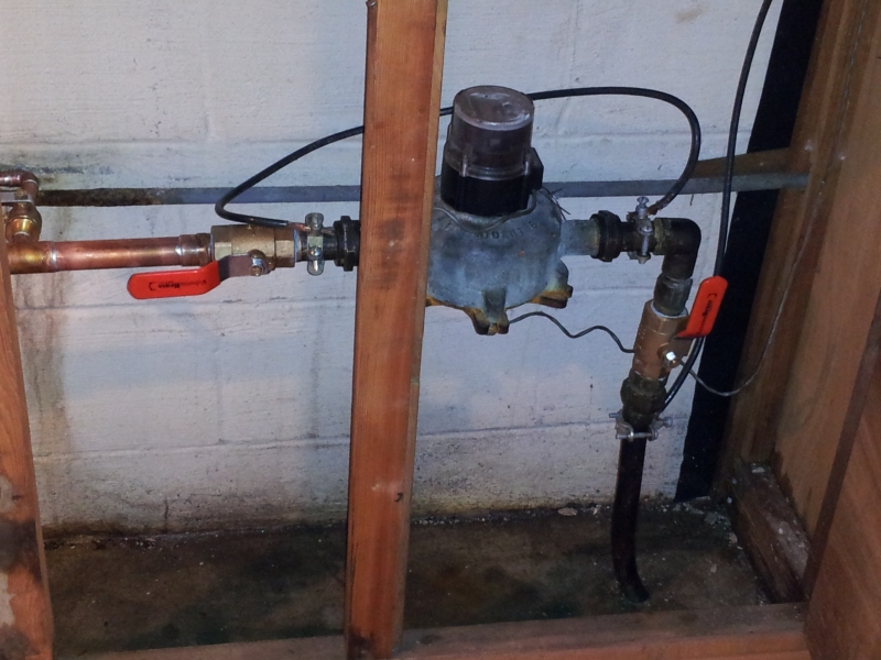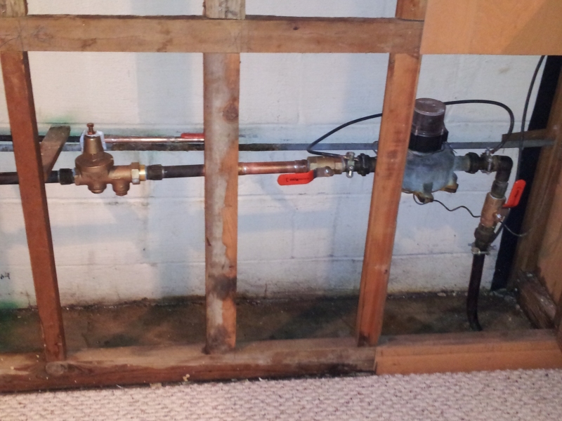 We were called to this house to replace the valves on the manifold and we found the regulator valve not functioning and the thermal expansion tank diaphram ruptured. We froze the incoming water line with an electric pipe freezer. This enabled us to change the incoming valve. Then we changed the manifold valves, regulator, and added a bigger thermal expansion tank (since there are two water heaters) and also added a means to facilitate annual checking of the air charge in the tank. That was something the prior tank lacked. All the ball valves with the orange handles are USA made Wolverine Brass valves.