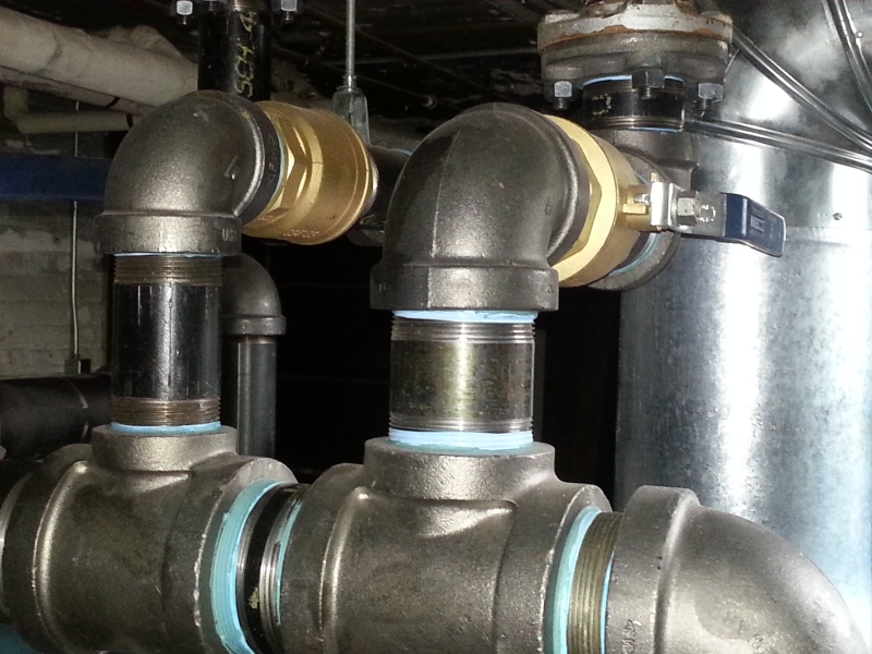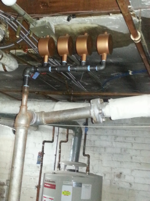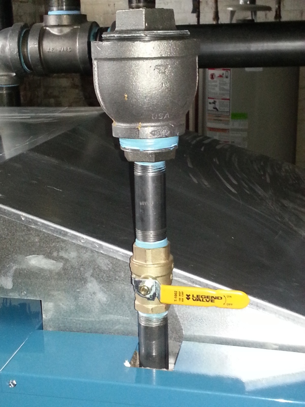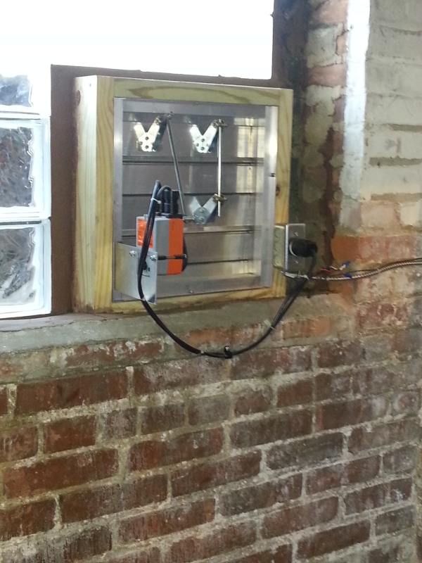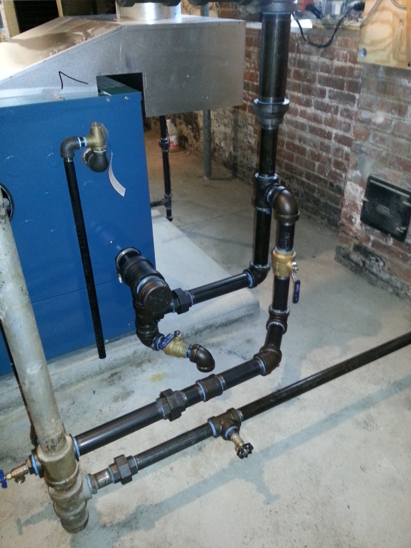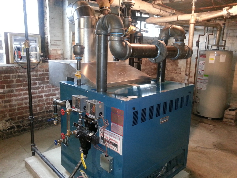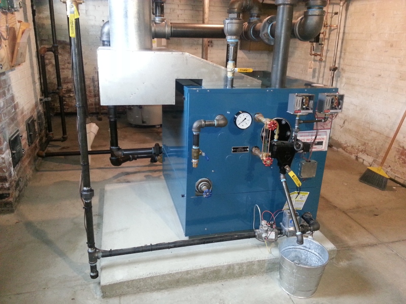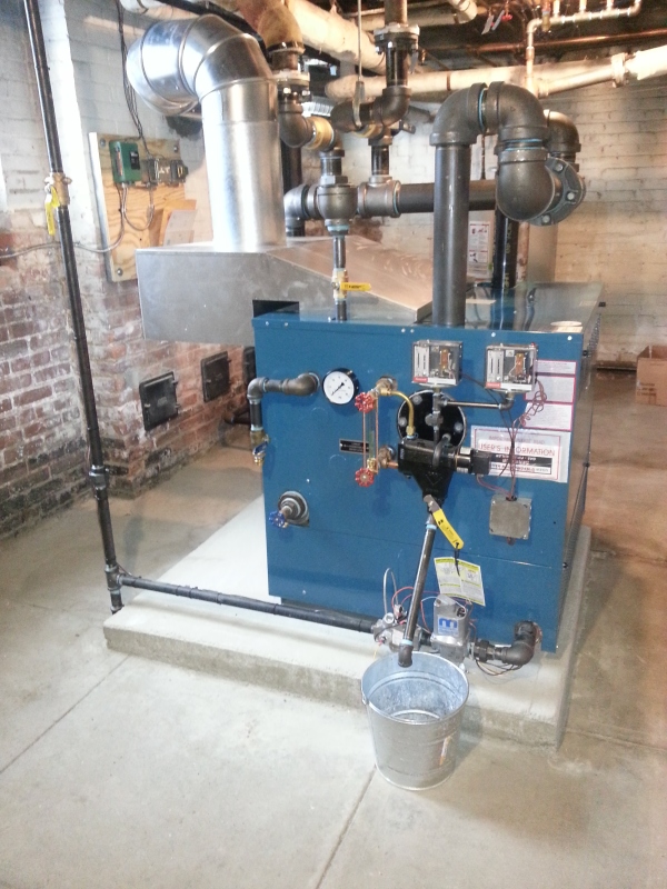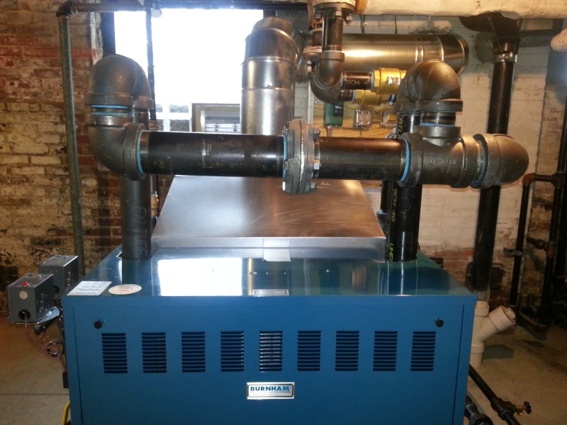We took out a boiler in this residence that had failed, and replaced it with a Burnham series 5 commercial boiler. The boiler is in a very small room to try and take its combustion air from, so we put a mechanical louvered air intake in the window and had glass block placed around it. There is an interlock so it has to be proven open before the boiler will be allowed to fire. A new 4'' pad was also installed for the boiler to sit on.