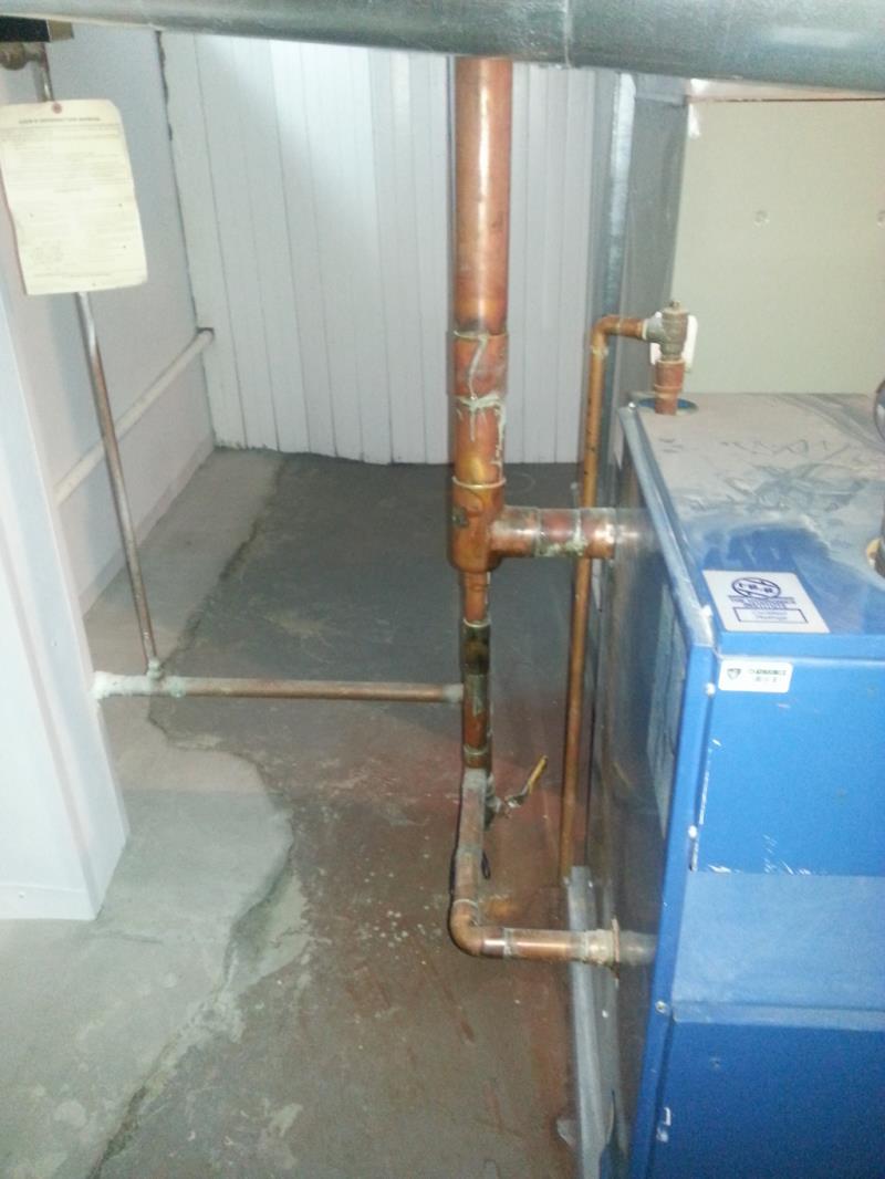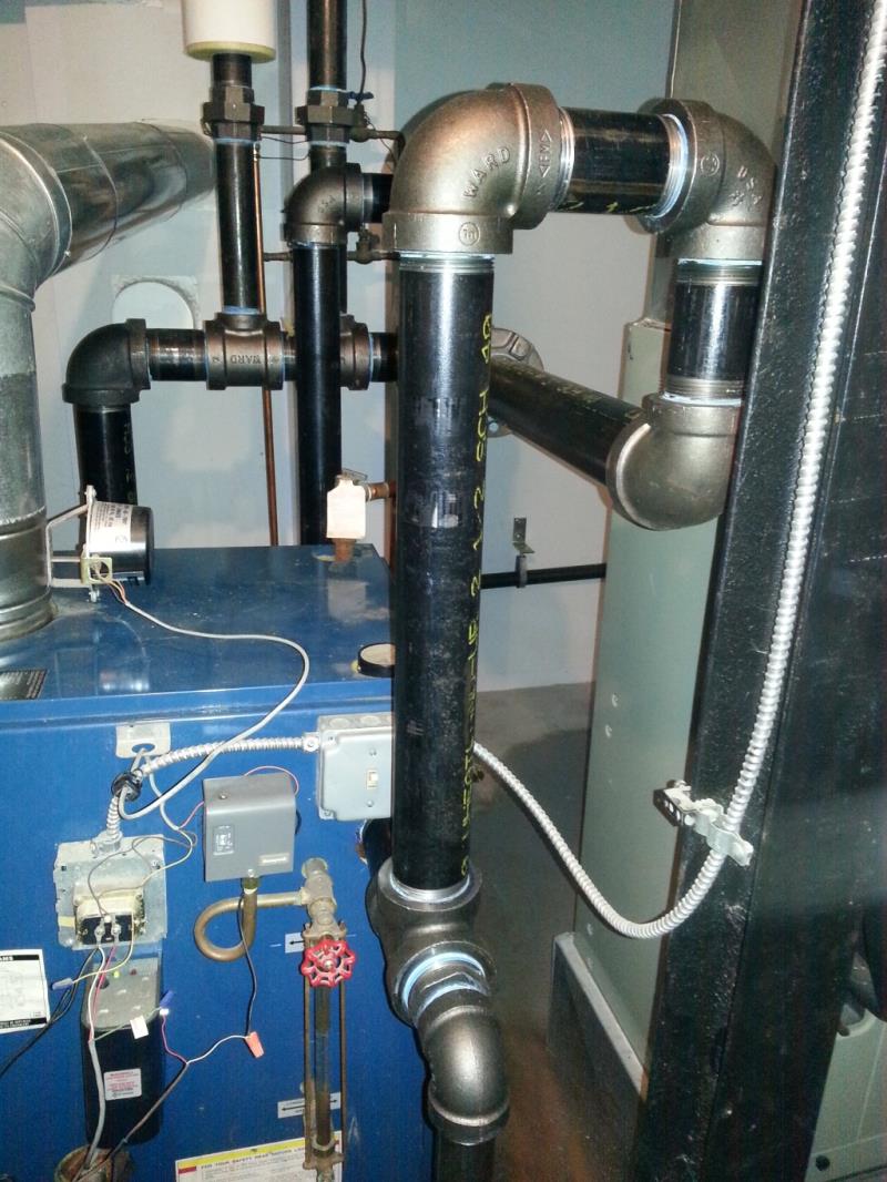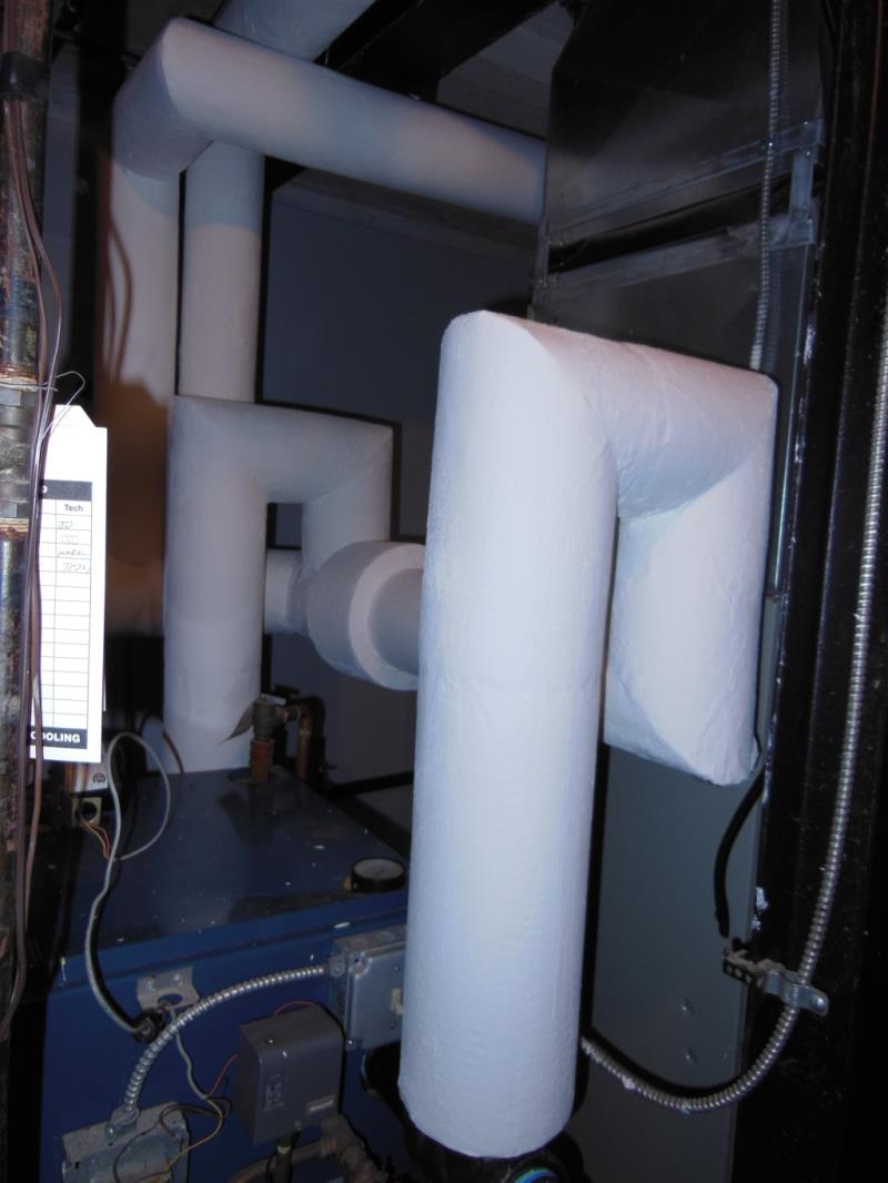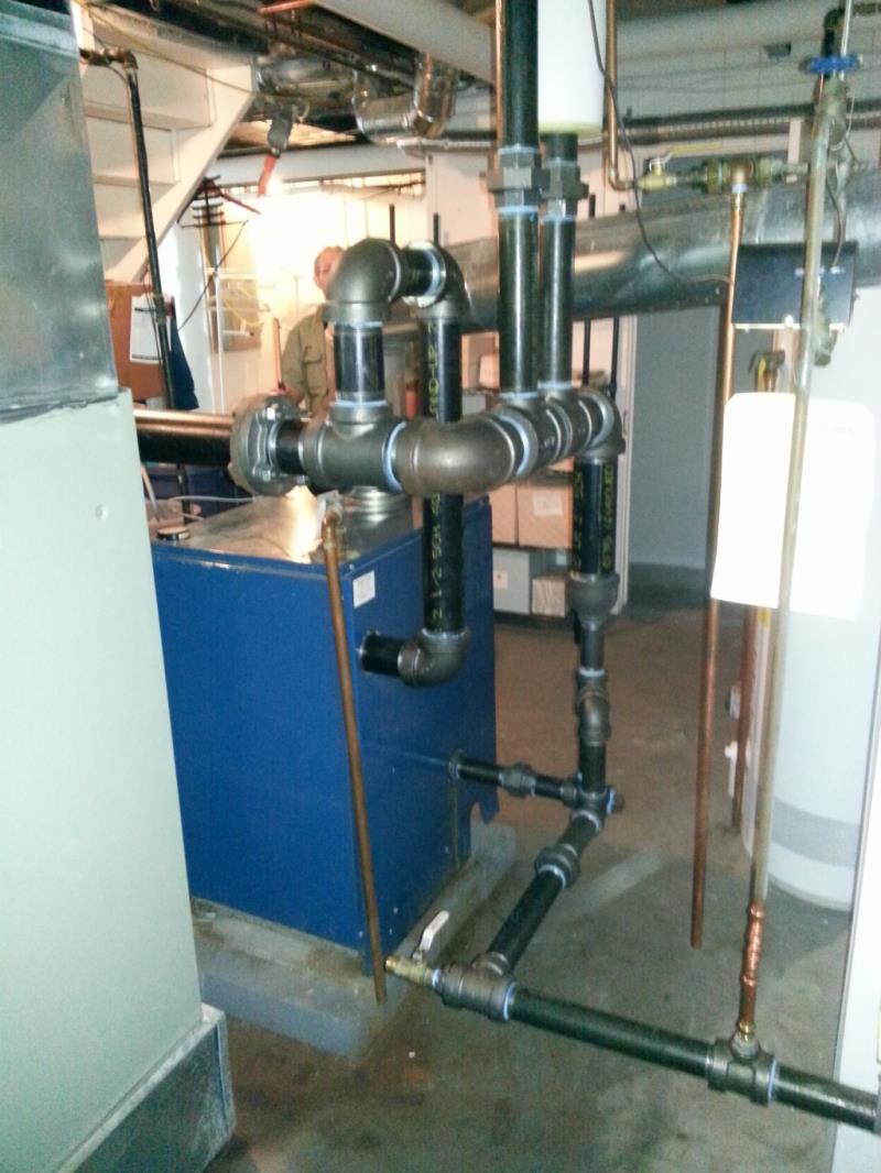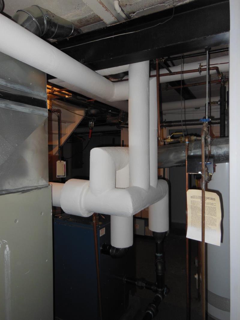 We were hired to re-pipe this poorly installed Dunkirk steam boiler. Forget the poor choice in header material. The original design was just completely wrong. We re-piped with a drop header and then Mark insulated the piping as part of a bigger insulation job. (he had us insulate the entire system that was visible.)