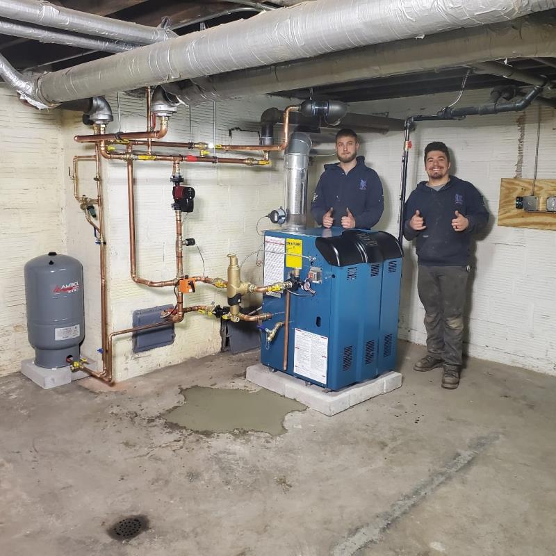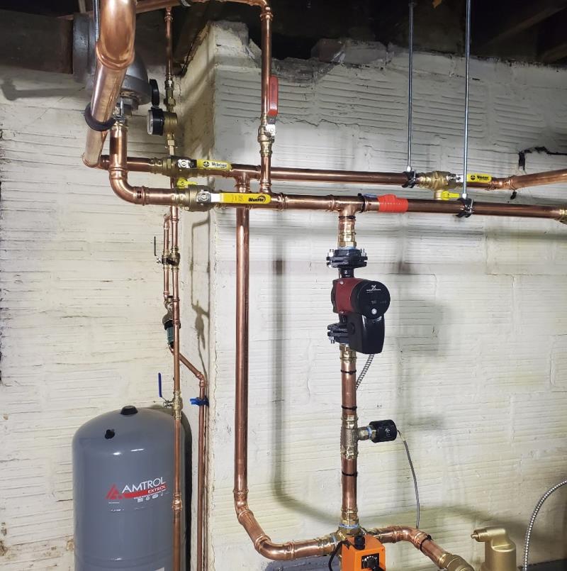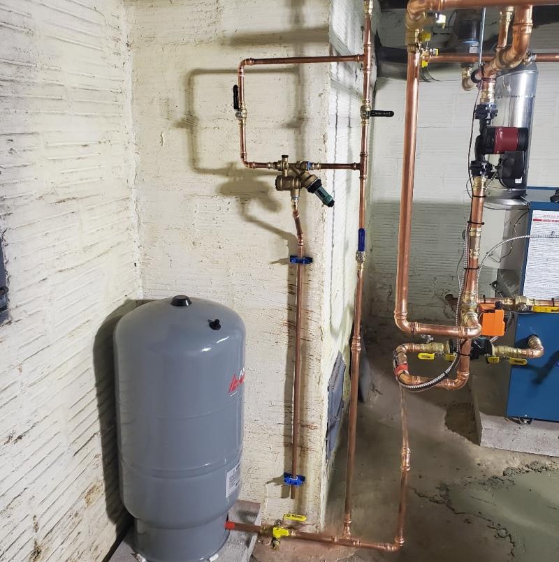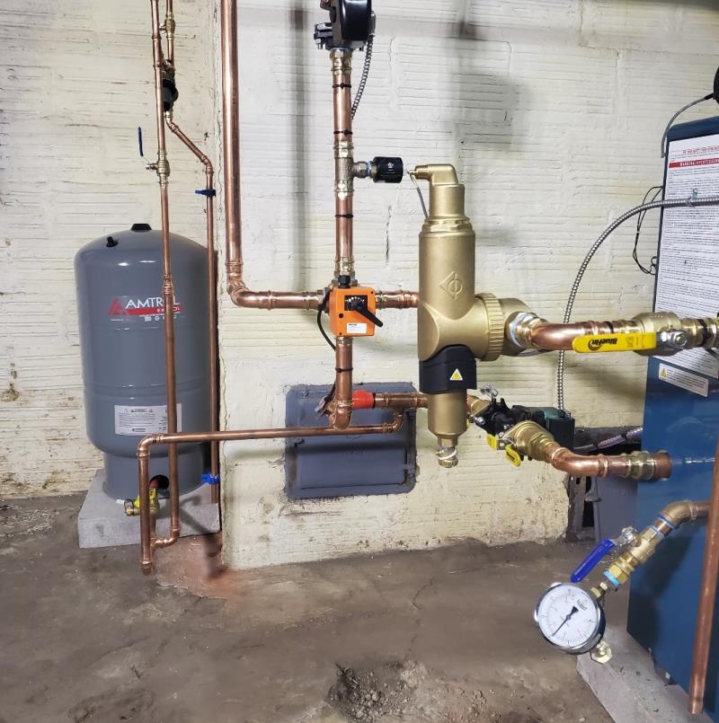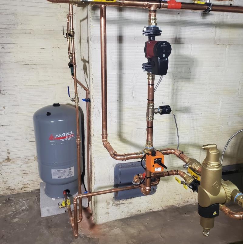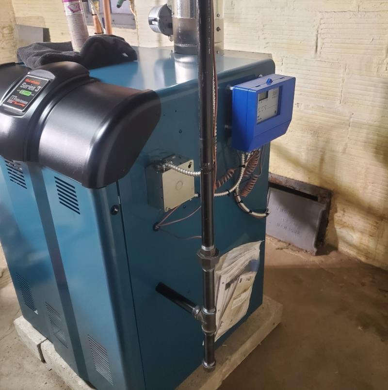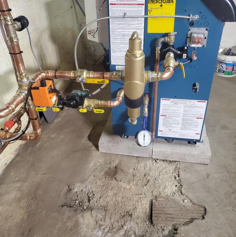 On this job we removed a poorly operating water boiler and the original coal boiler and installed a new Burnham series 3 water boiler. When installing a cast iron water boiler on a system that was once gravity hot water, some kind of provision must be included to protect the boiler from sustained flue gas condensation. This is because of the tremendous amount of cool water in the system. On this boiler we opted to use a motorized 4 way mixing valve that doesn’t let water flow to the system unless the temperature at the boiler is above 130 degrees.